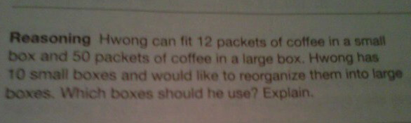 “Reasoning Hwong can fit 12 packets of coffee in a small box and 50 packets of coffee in a large box. Hwong has 10 small boxes and would like to reorganize them into large boxes. Which boxes should he use? Explain.”